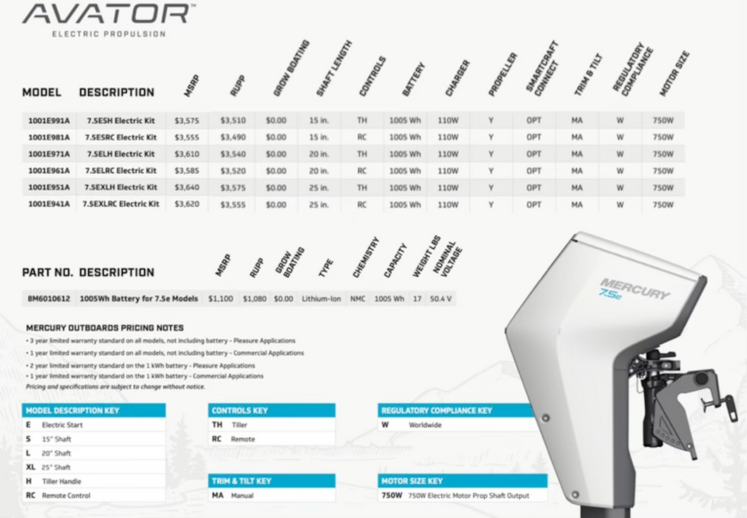 | MODEL | Mercury Avator 7.5E Electric Outboard |